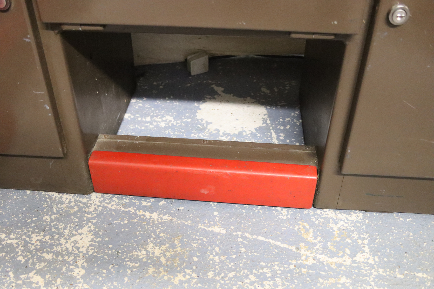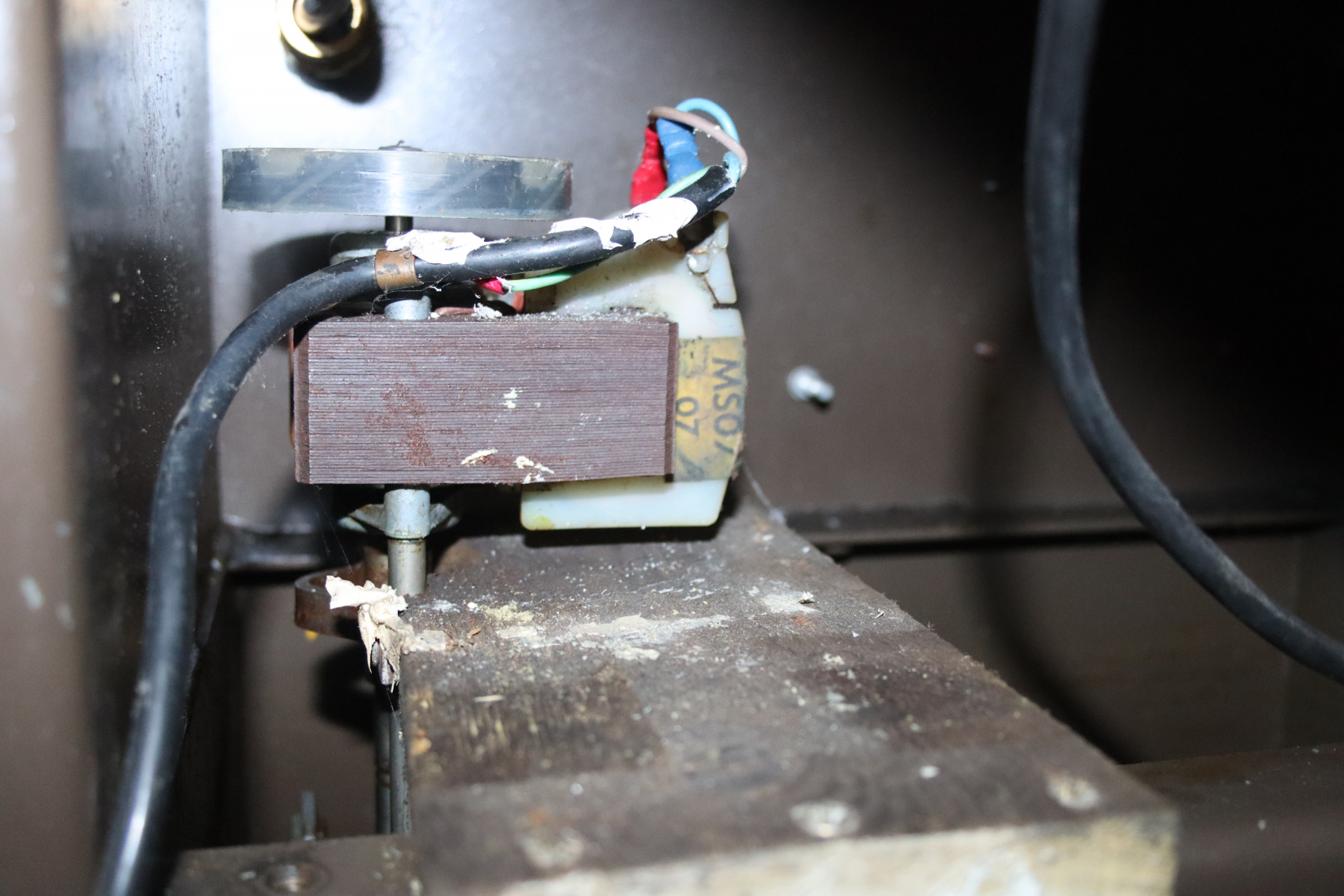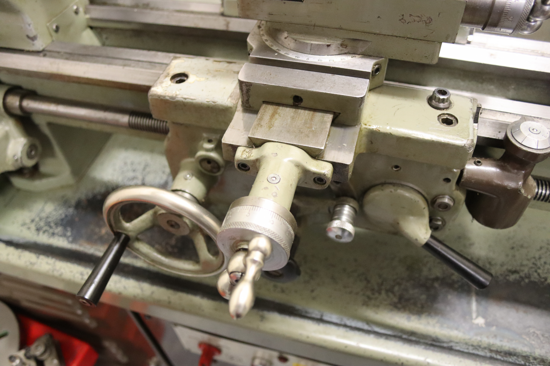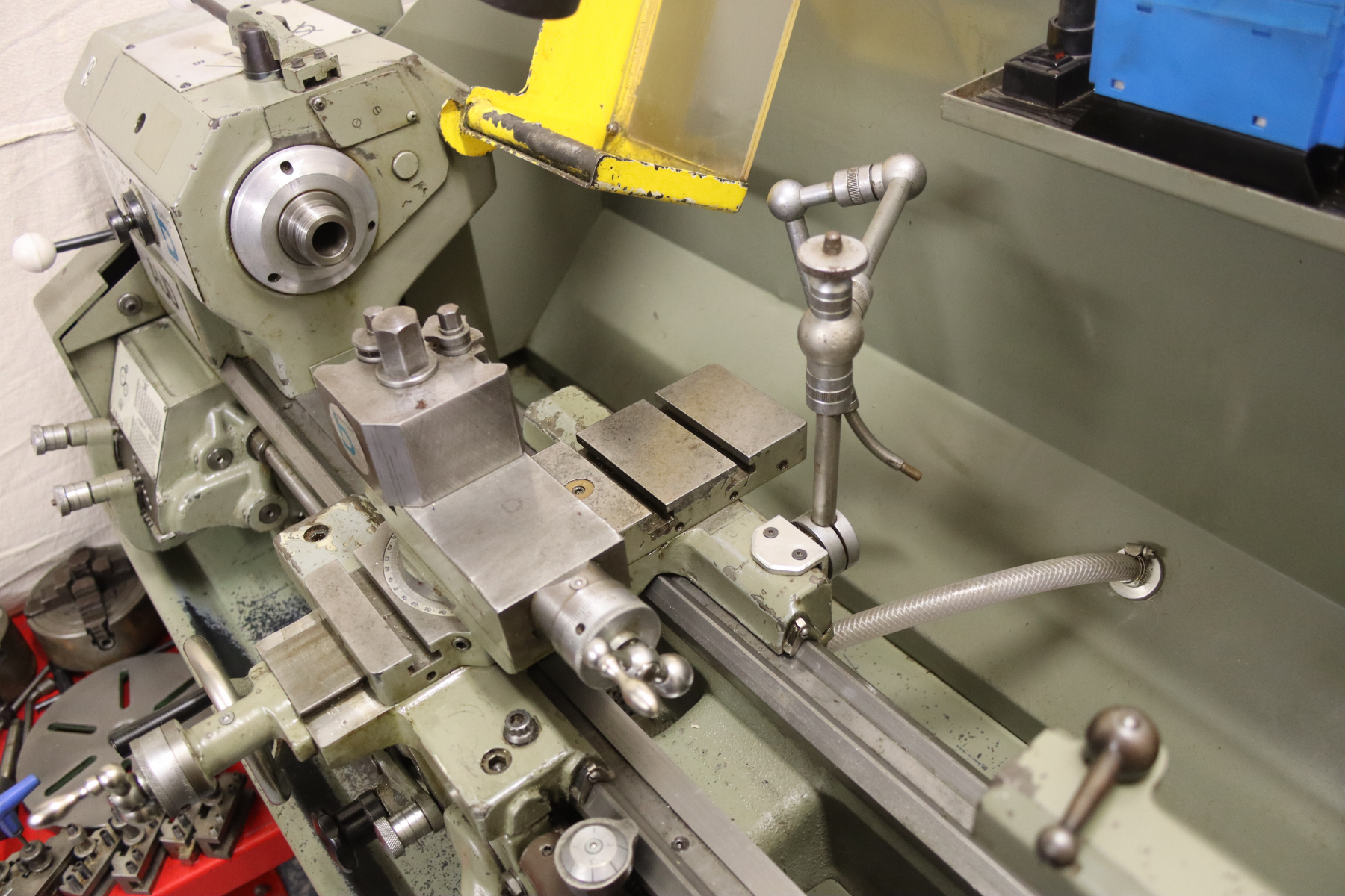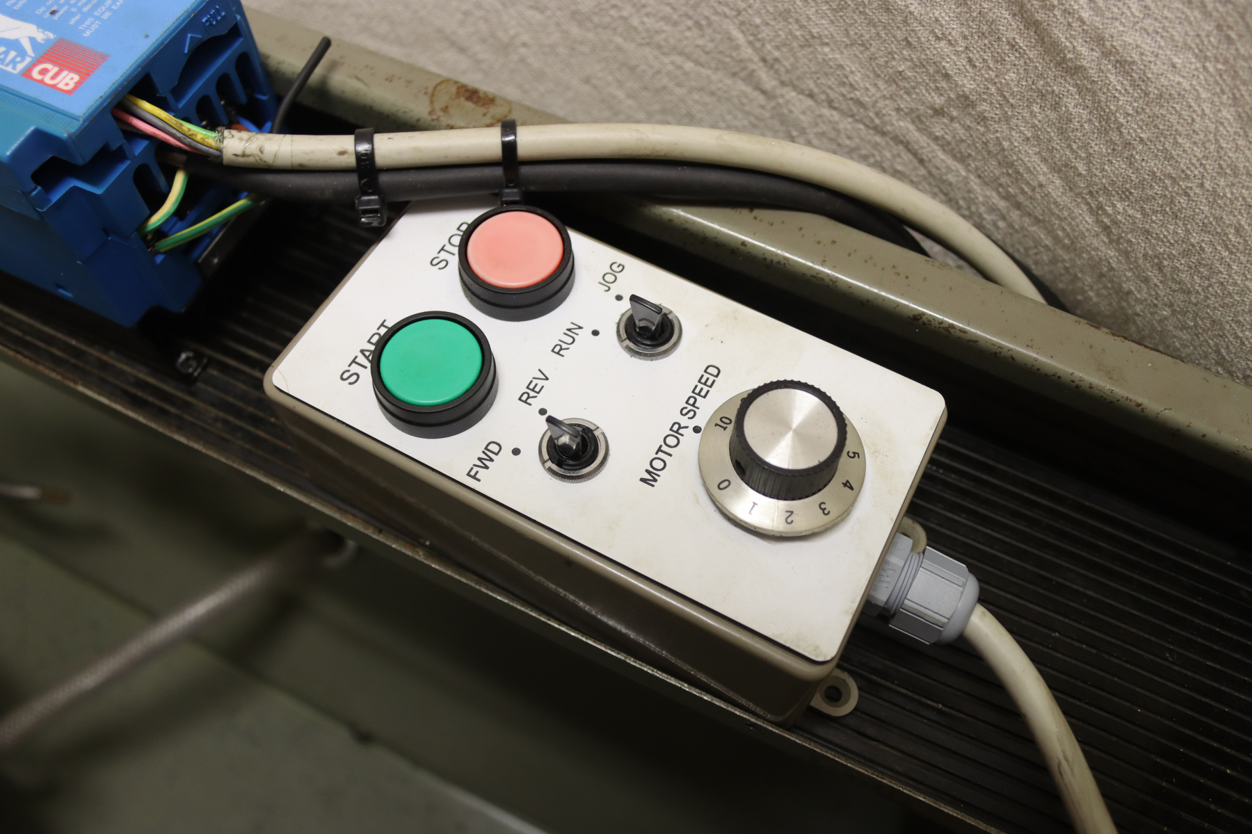 It is fitted with a Brook Crompton Parkinson 3 phase motor and it has an IMO Jaguar Cub inverter to allow it to be powered from a standard single phase 240V socket. This 3 phase supply connects to the control panel in the middle of the stand where the on / off controls plus forward and reverse switch is located. Four safety interlocks are provided to the chuck guard, gear guard, motor housing door and foot kick switch. Some adjustment of speed can be controlled via the remote unit but note that the relays on the main switch panel won’t hold if the speed setting on the remote is set below about the 50% point. Plus the work light starts to look a bit dim as that is also wired through the transformer in the switch panel!