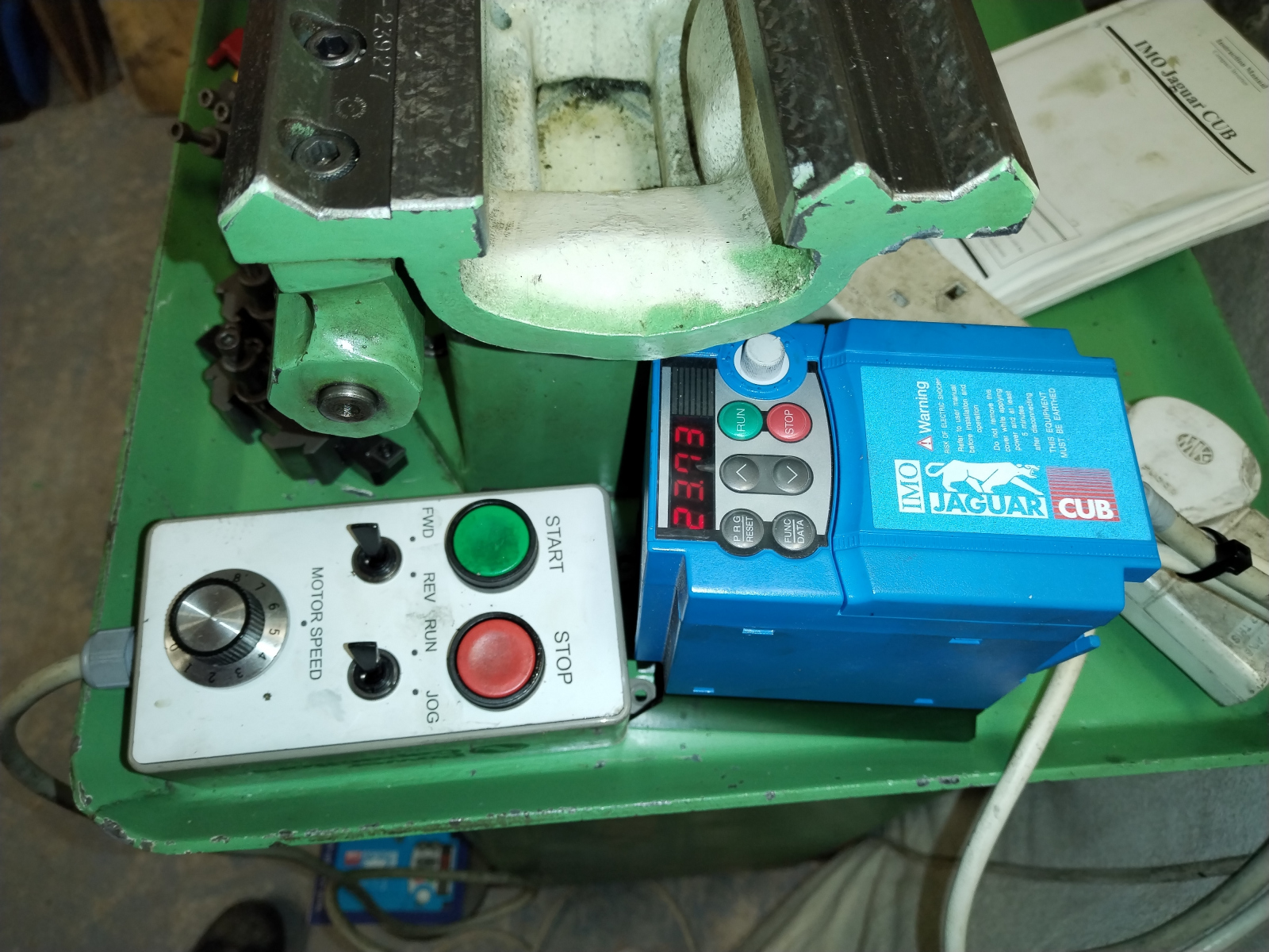 It is fitted with a Brook Crompton Parkinson 3 phase motor and it has an IMO Jaguar Cub inverter to allow it to be powered from a standard single phase 240V socket. The remote control unit allows direction control and variable speed control of the spindle.