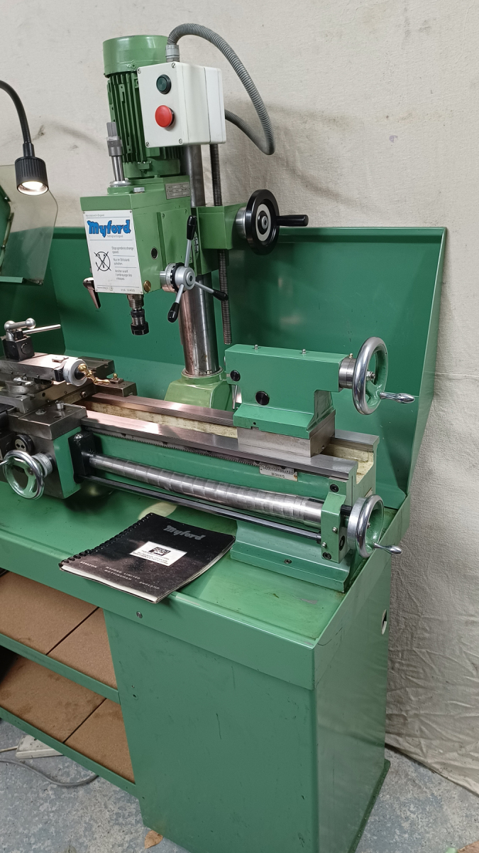 This is a Myford 254V plus long bed lathe with vertical milling / drilling attachment, considered by some to represent the zenith of Myford lathe production. The serial number of the lathe is ZS164478 indicates the lathe was probably made around 1989.