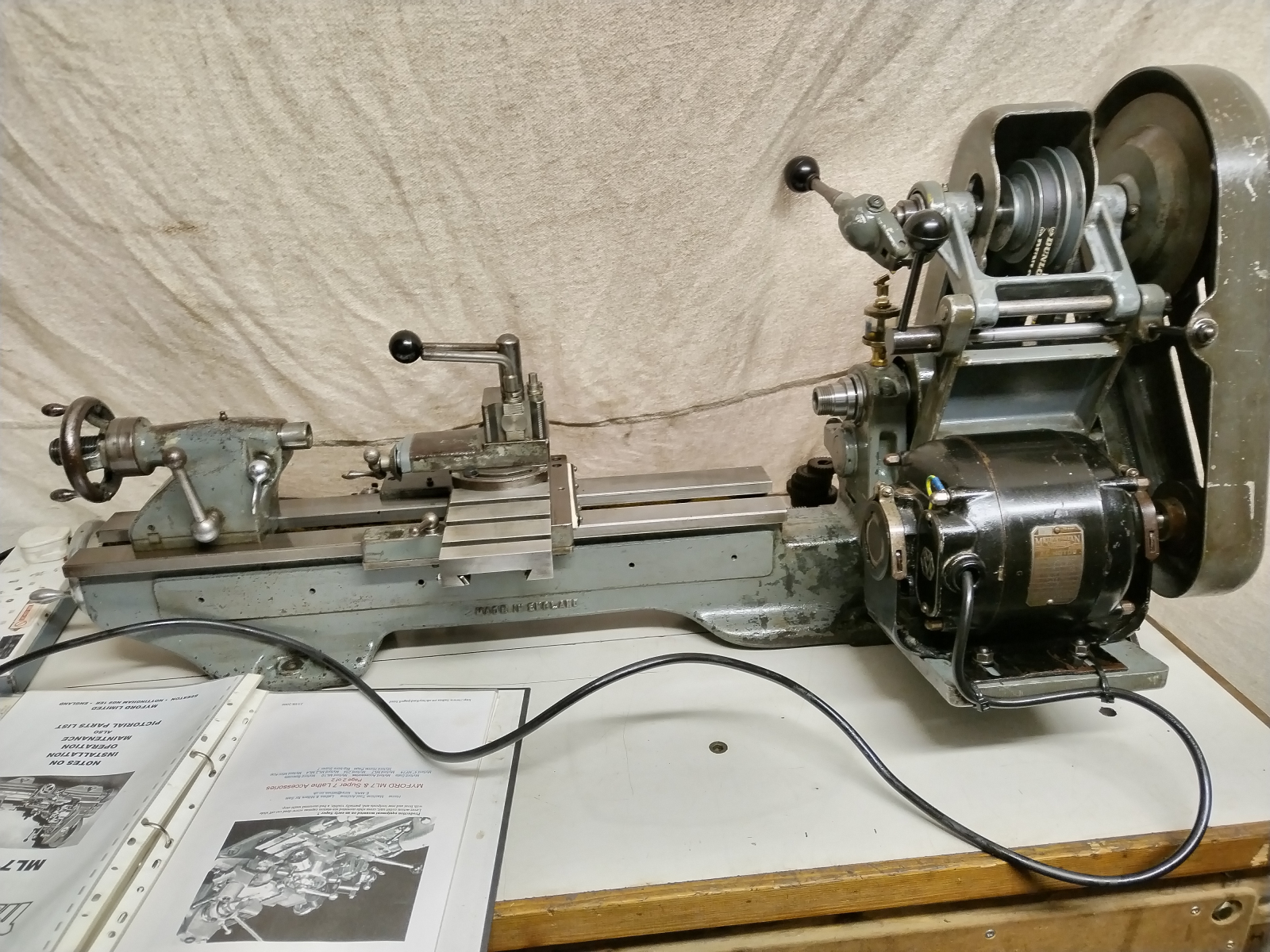 This is a Myford ML 7 lathe bearing the serial number K19948 which means it was manufactured in 1950
