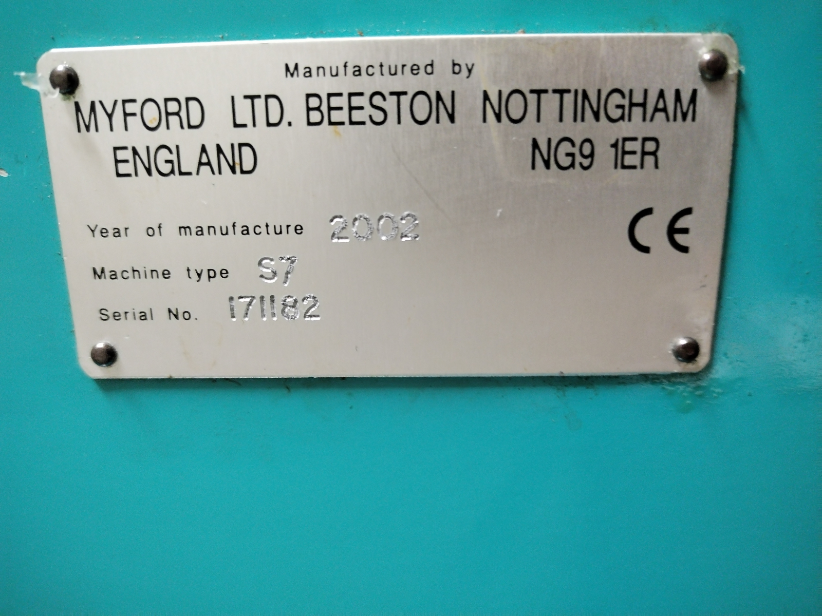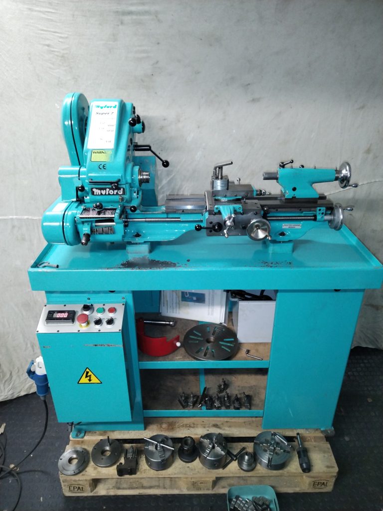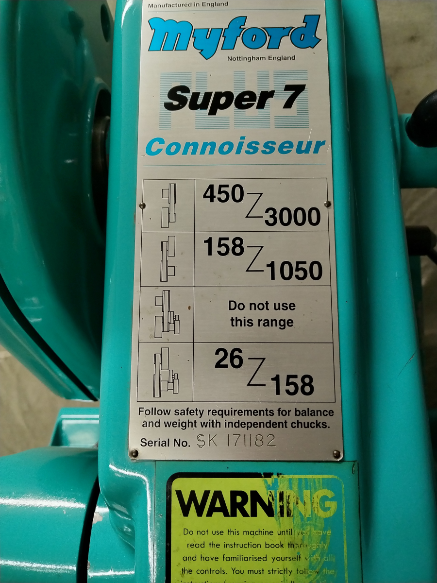 This is a Myford Super 7 Connoisseur “Big Bore” lathe bearing the serial number SK171182 and which the makers plate says its year of manufacture was 2002. It is fitted with quick change screw cutting gearbox serial number QC170863 and it has power cross feed plus there is a screw cutting dial indicator fitted. The lathe is mounted on an industrial style Myford cabinet with riser blocks.