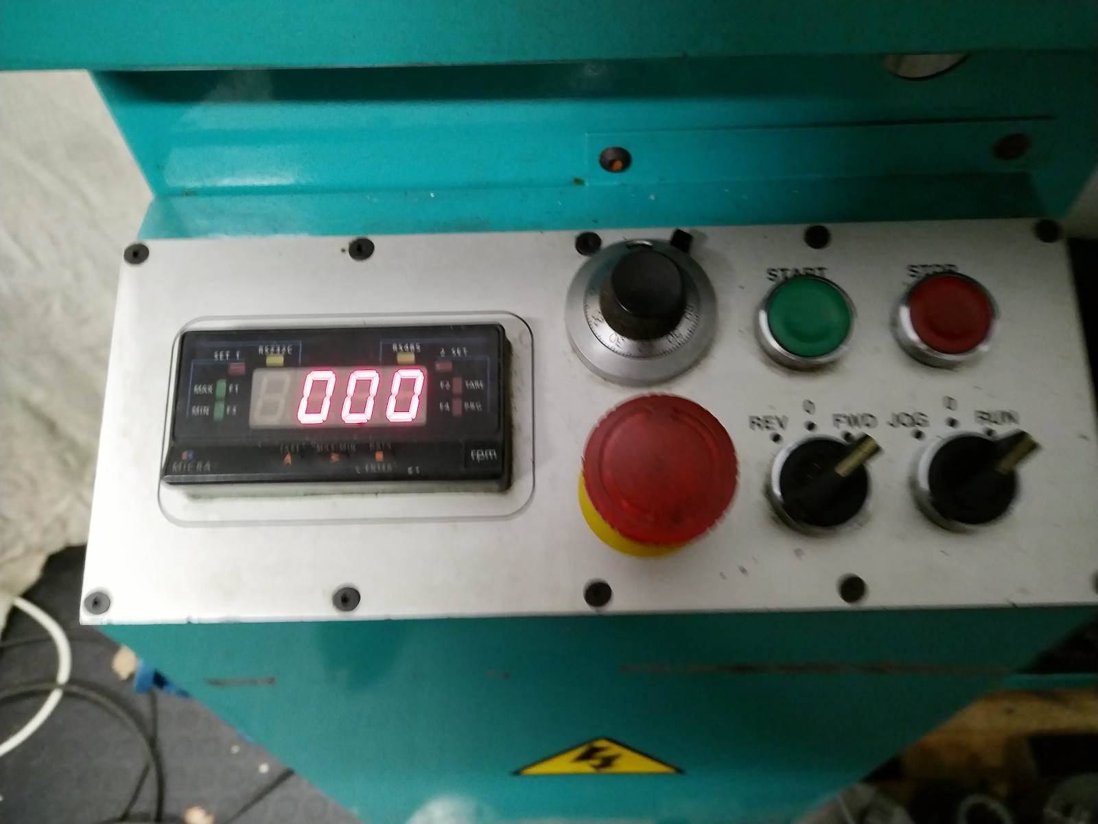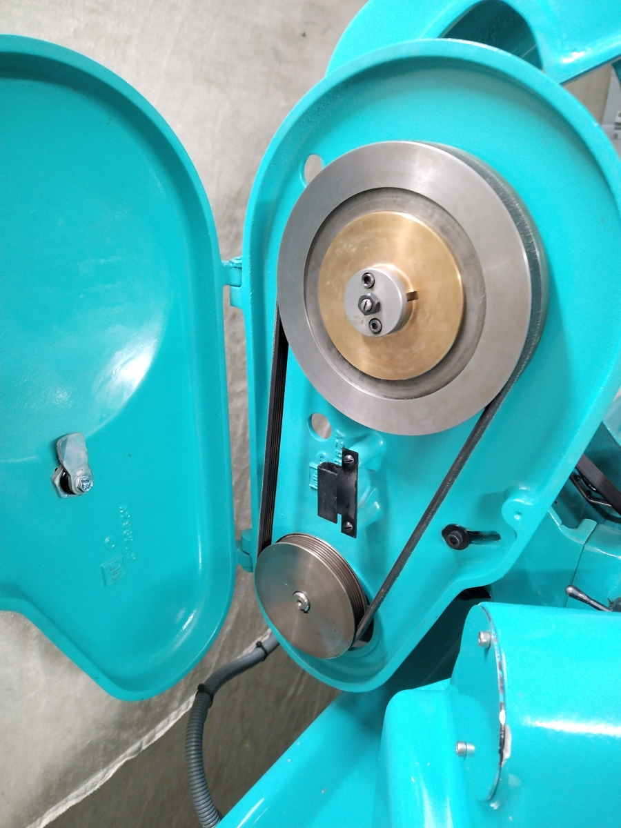 It is powered from a standard 240V domestic supply, with the box to the left hand side of the cabinet containing the 3 phase inverter supply to the motor allowing variable speed control of the spindle. There is a digital read out showing the spindle speed. Also within the stand is a coolant pump. The coolant pump is operated by a switch mounted on top of its motor, it runs but has not been tested with coolant to prove that it pumps.