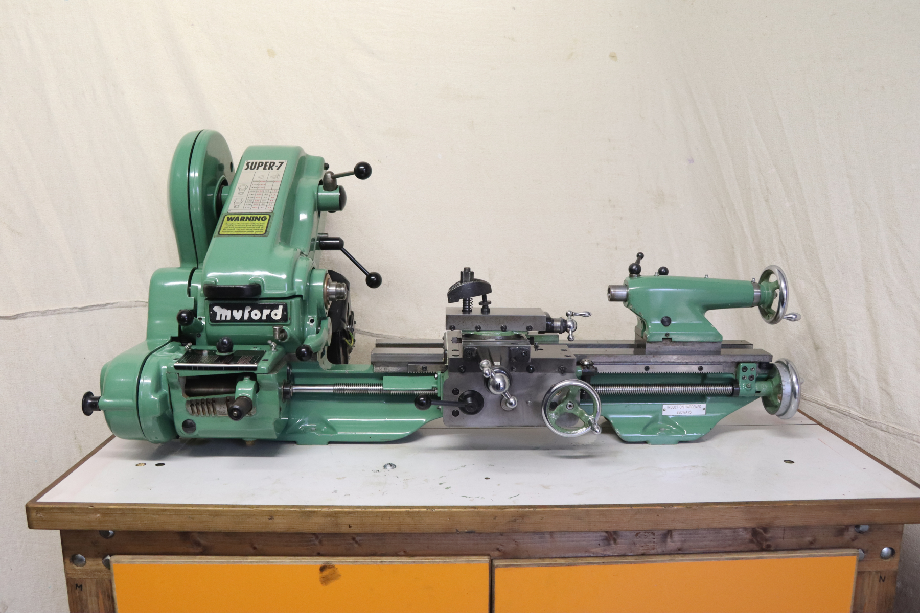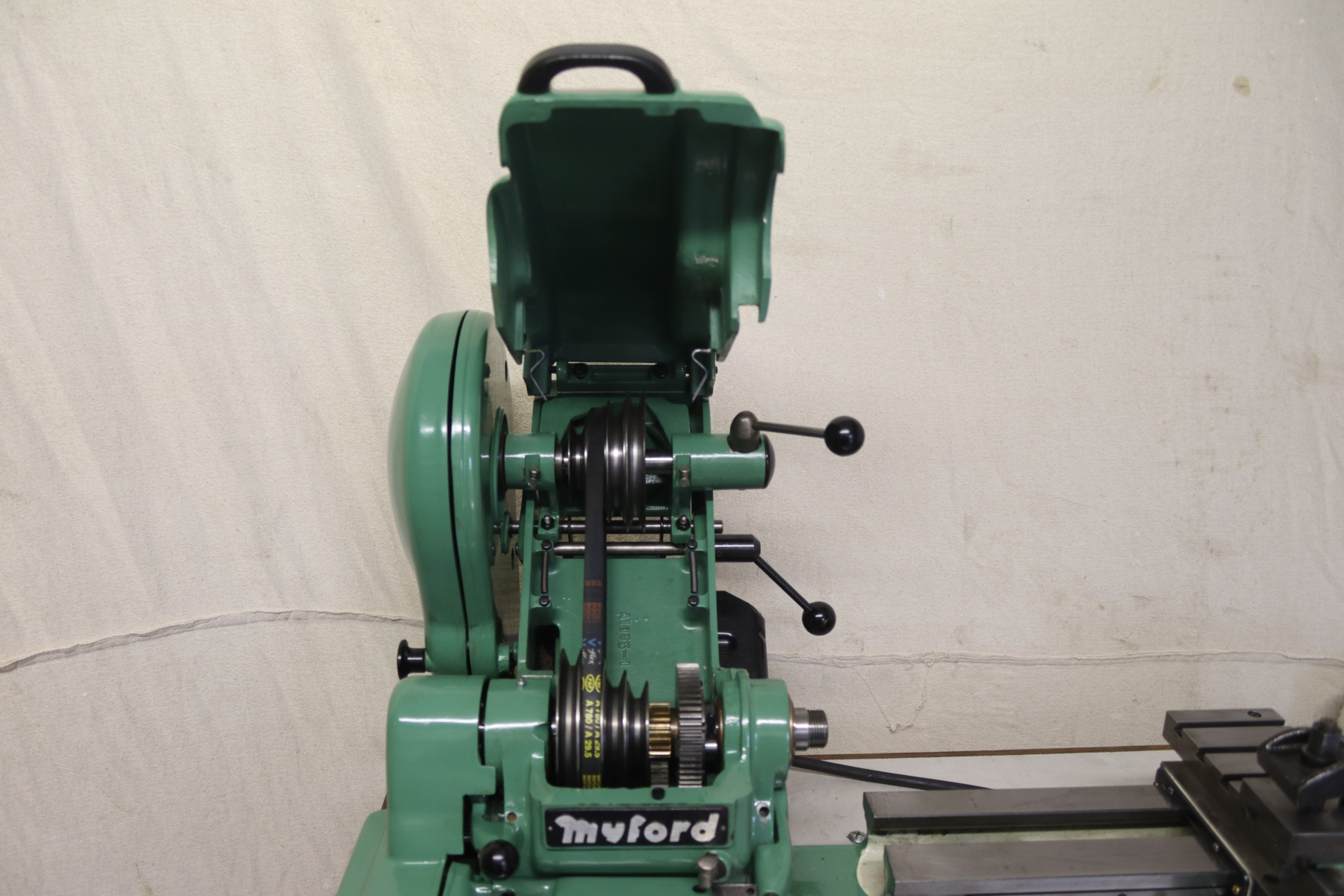 This is a Myford Super 7 lathe with induction hardened bedways bearing the serial SK163942 which dates the year of manufacture to be between 1988 and 1991. Power cross feed is fitted as standard to this lathe. The serial number of the gearbox is QC164846. There is also a thread dial indicator fitted to the carriage.