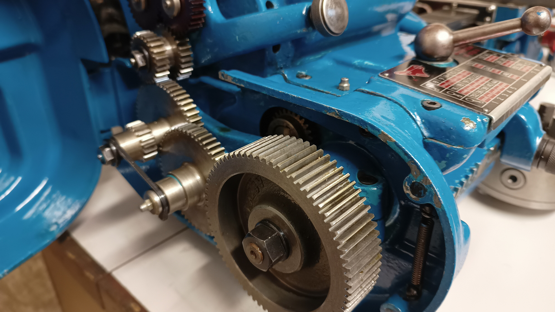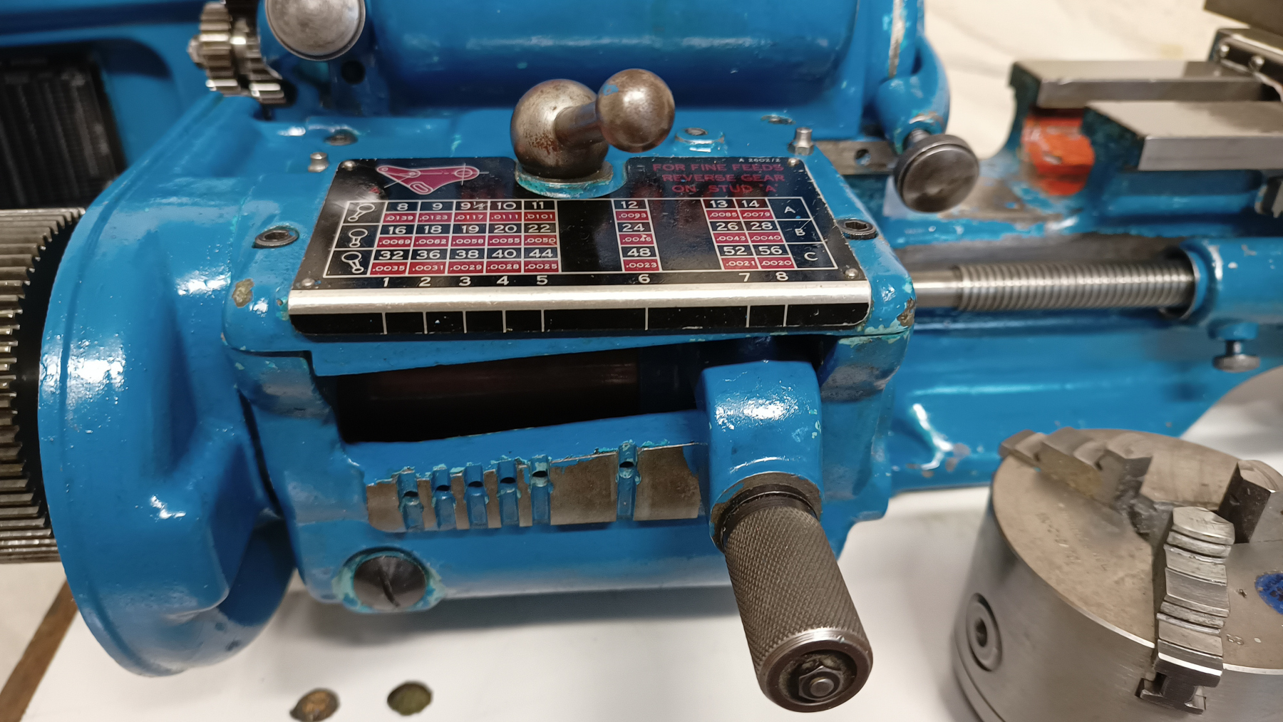It has brand new vee belts on the primary drive motor to countershaft and secondary drive countershaft to headstock, plus a new wiper felt. The hand traverse pinion has also been replaced as the shaft of the original one was looking a bit worn.