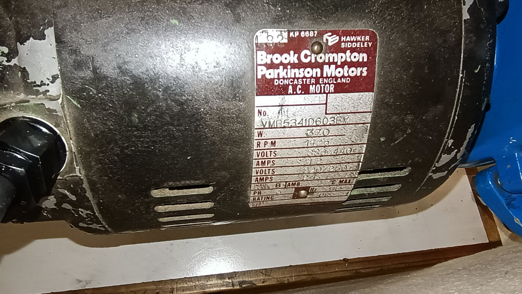 It is powered by a Brook Crompton Parkinson 370W 3 phase motor, with a capacitor based 3 phase converter allowing operation from a standard single phase socket.