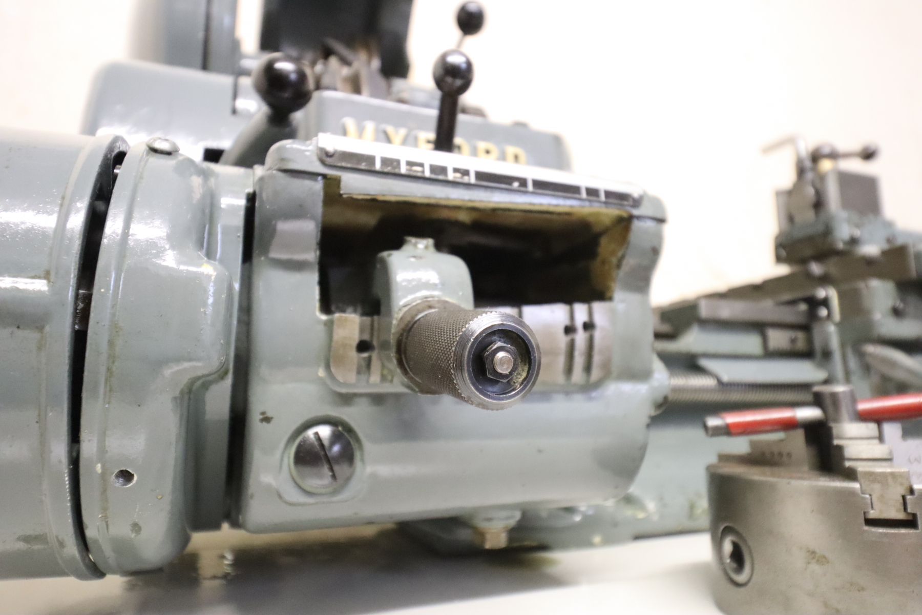 This is a Myford Super 7 lathe bearing the serial number SK77428 which dates it to the year range 1966 to 1968. It is fitted with Myford gearbox serial number QC76589 plus there is a screw cutting dial indicator fitted.