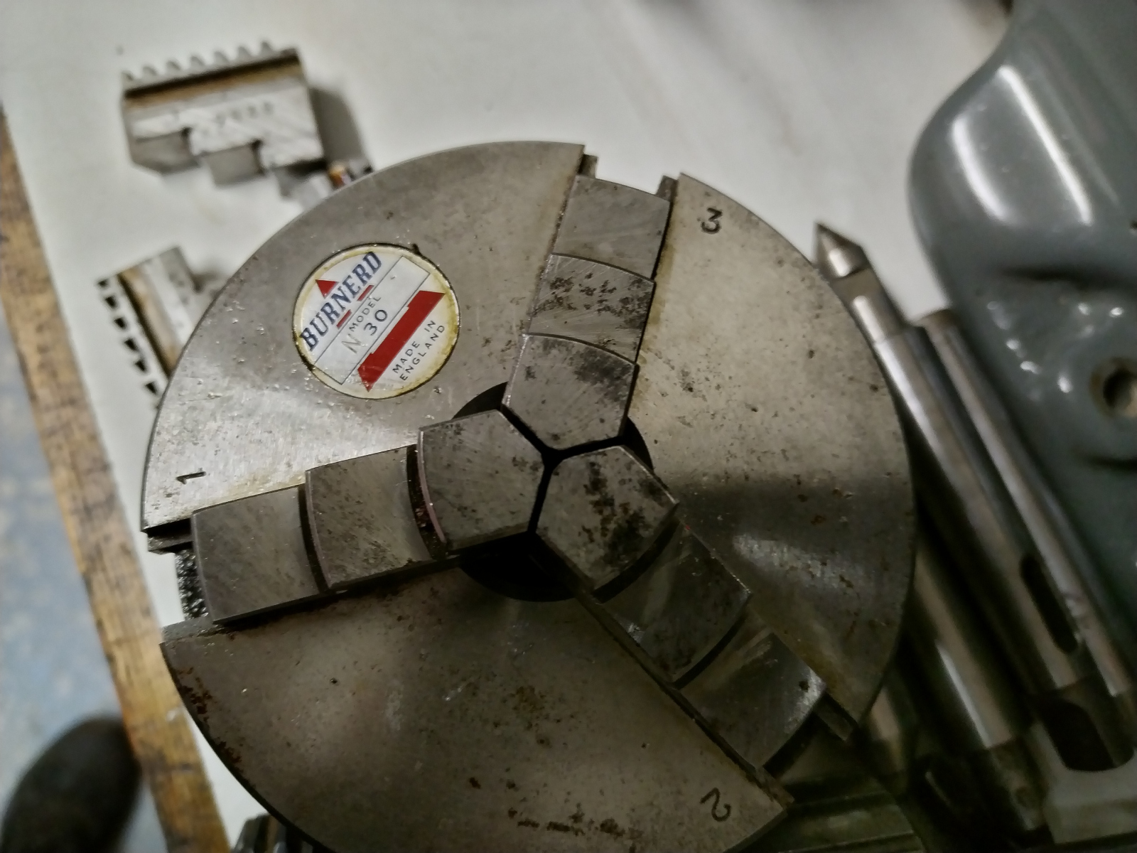 - Burnerd Model 30M 3 jaw self centering chuck with inside and outside jaws plus chuck key