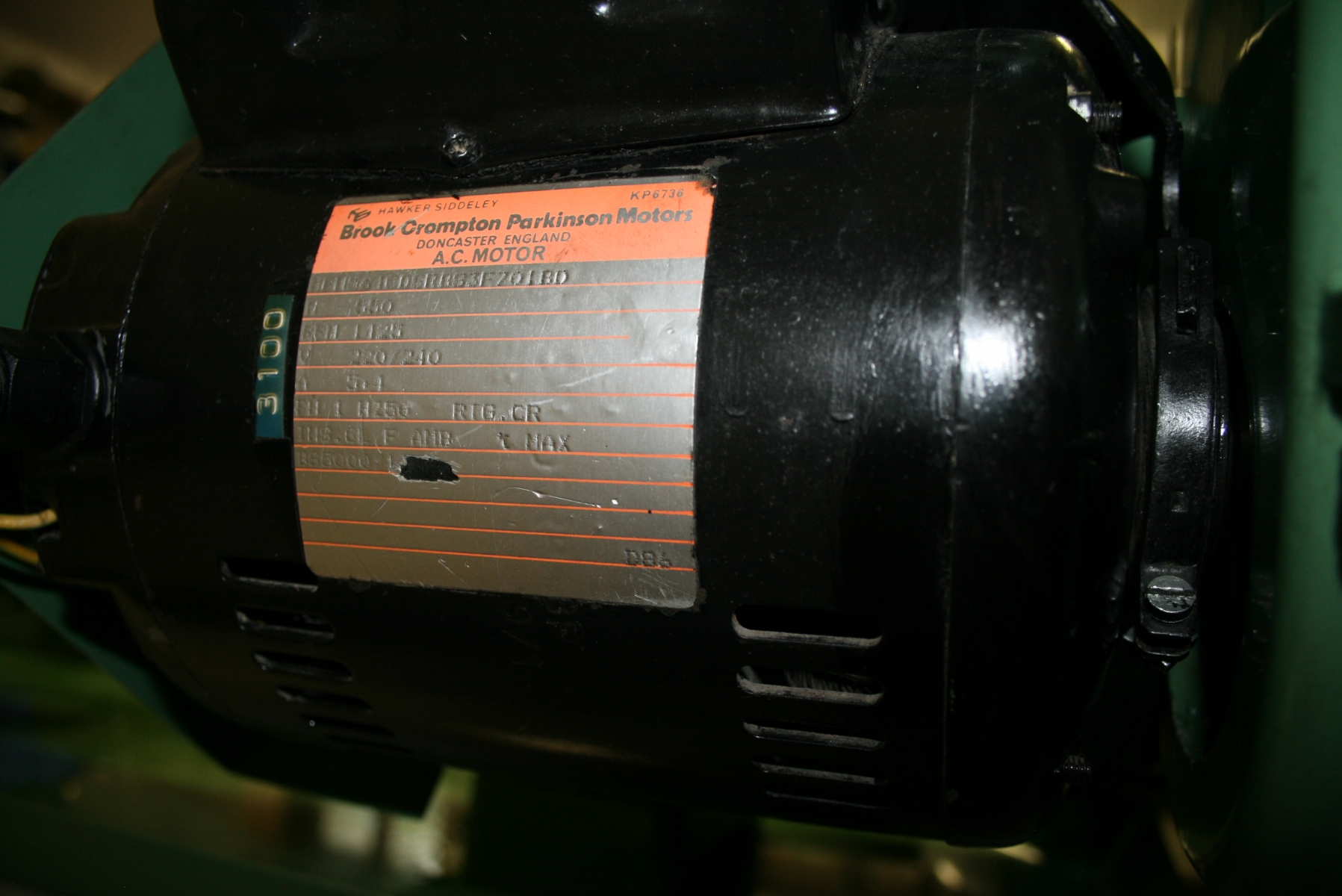 The motor is a single phase 240V Brook Crompton Parkinson Motors 550W / 1425 RPM unit, with an NVR switch unit that supports forward and reverse operation.