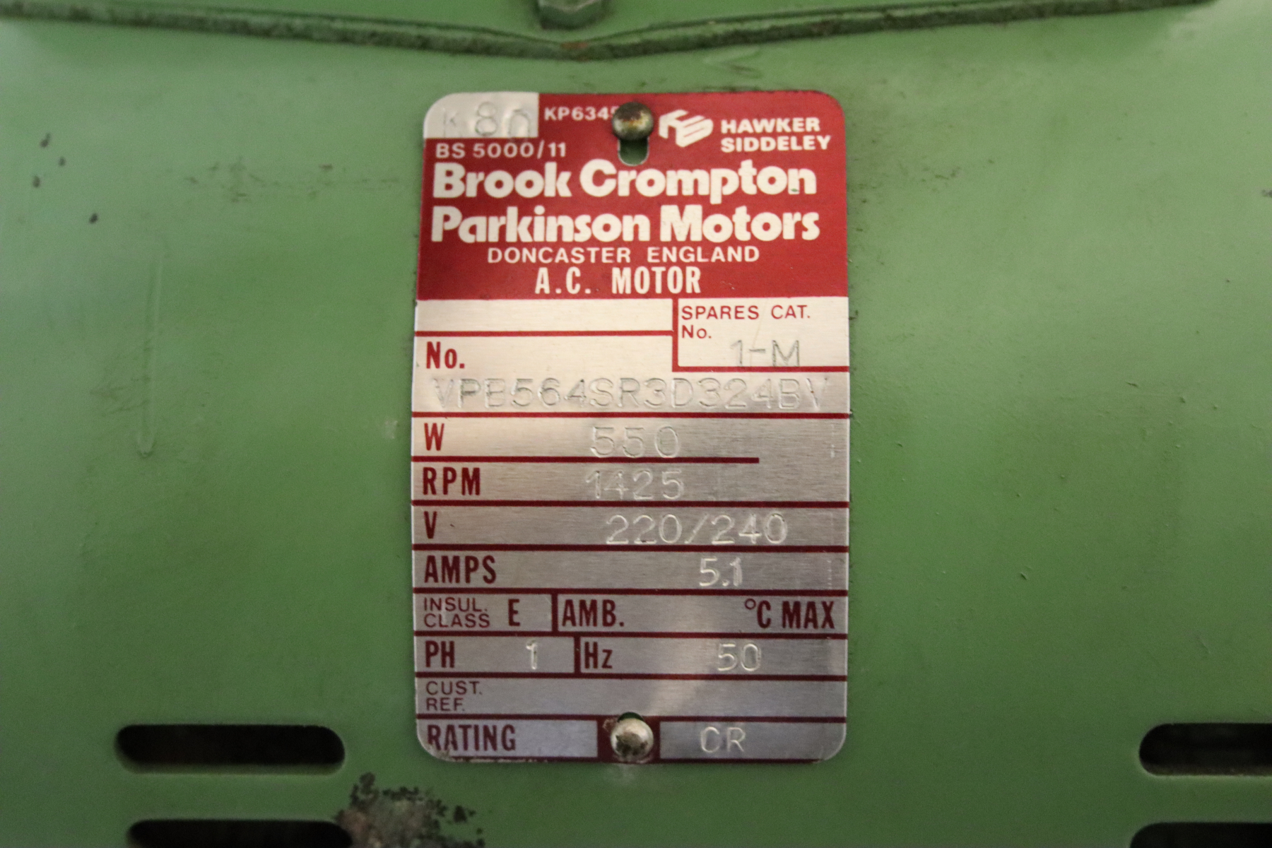 It has with a single phase 240V, 550W 1425 RPM Brook Crompton Parkinson motor.