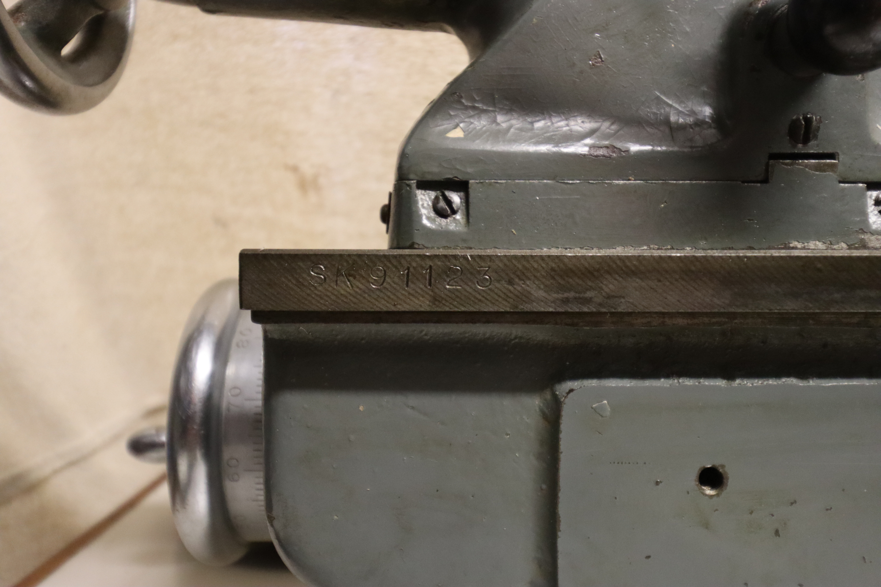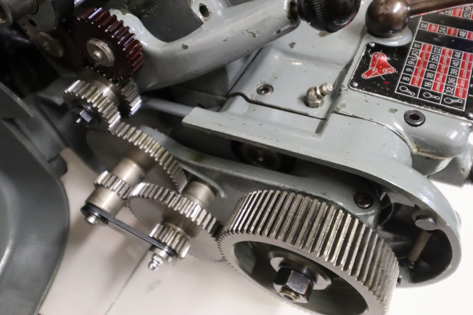 This is a Myford Super 7 lathe bearing the serial number SK91123 which dates it to the year range 1968 to 1971. It is fitted with Myford gearbox serial number QC90082 plus there is a screw cutting dial indicator fitted.