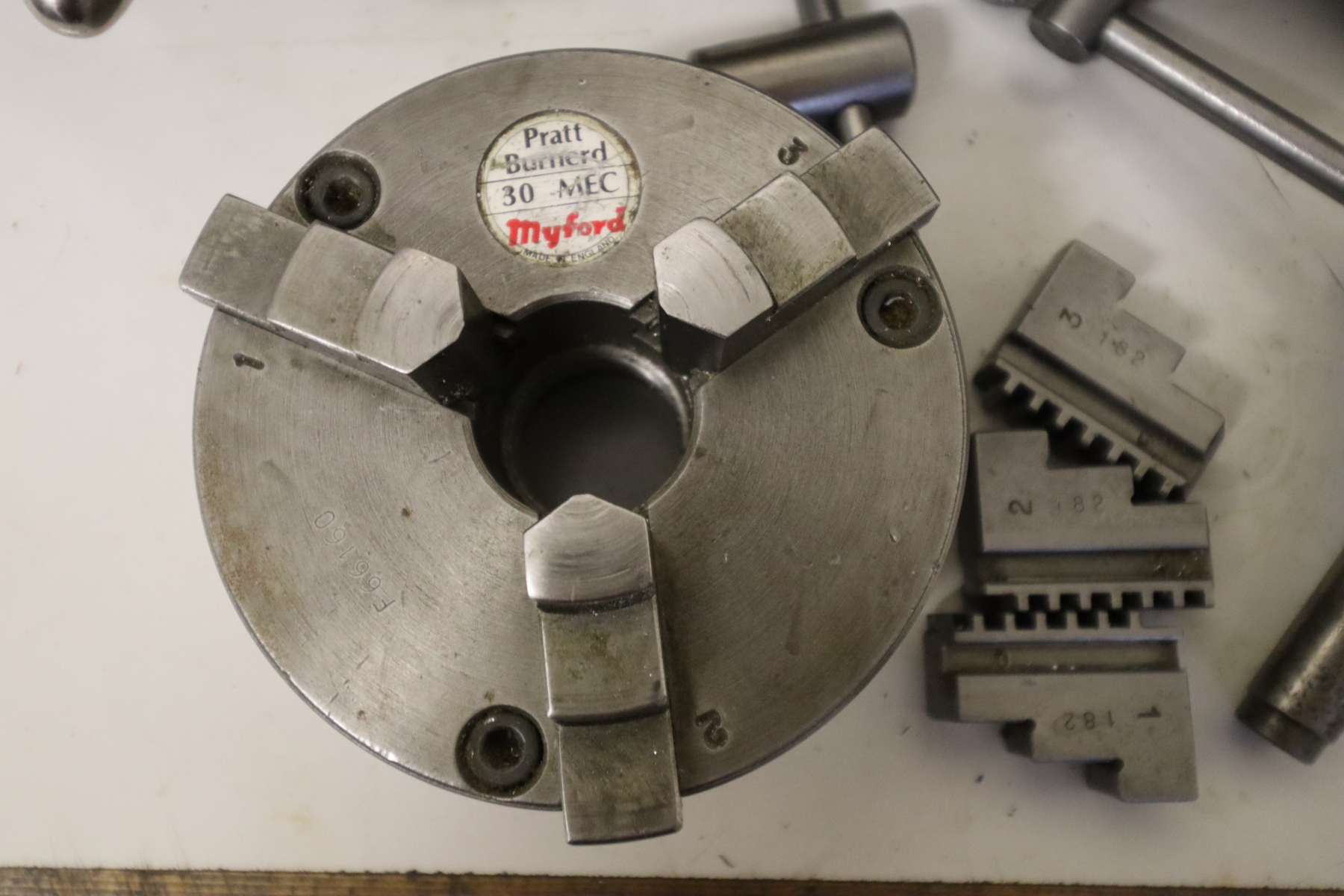 - 4″ 3 jaw Bratt Burnerd / Myford self centering scroll chuck with inside and outside jaws and chuck key.