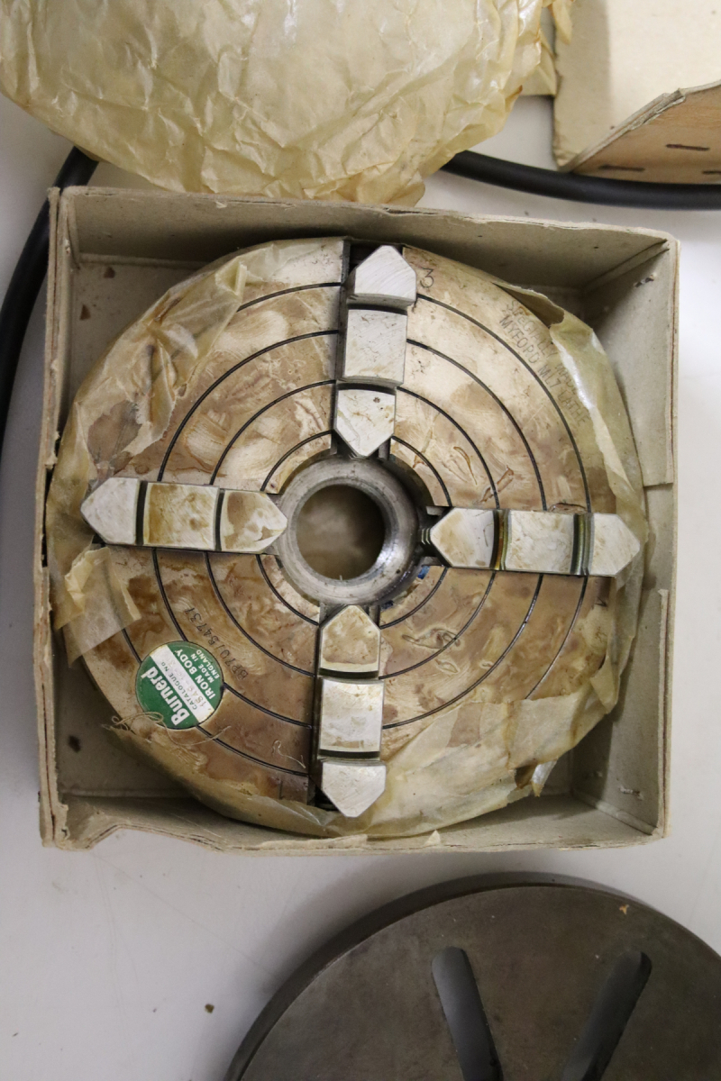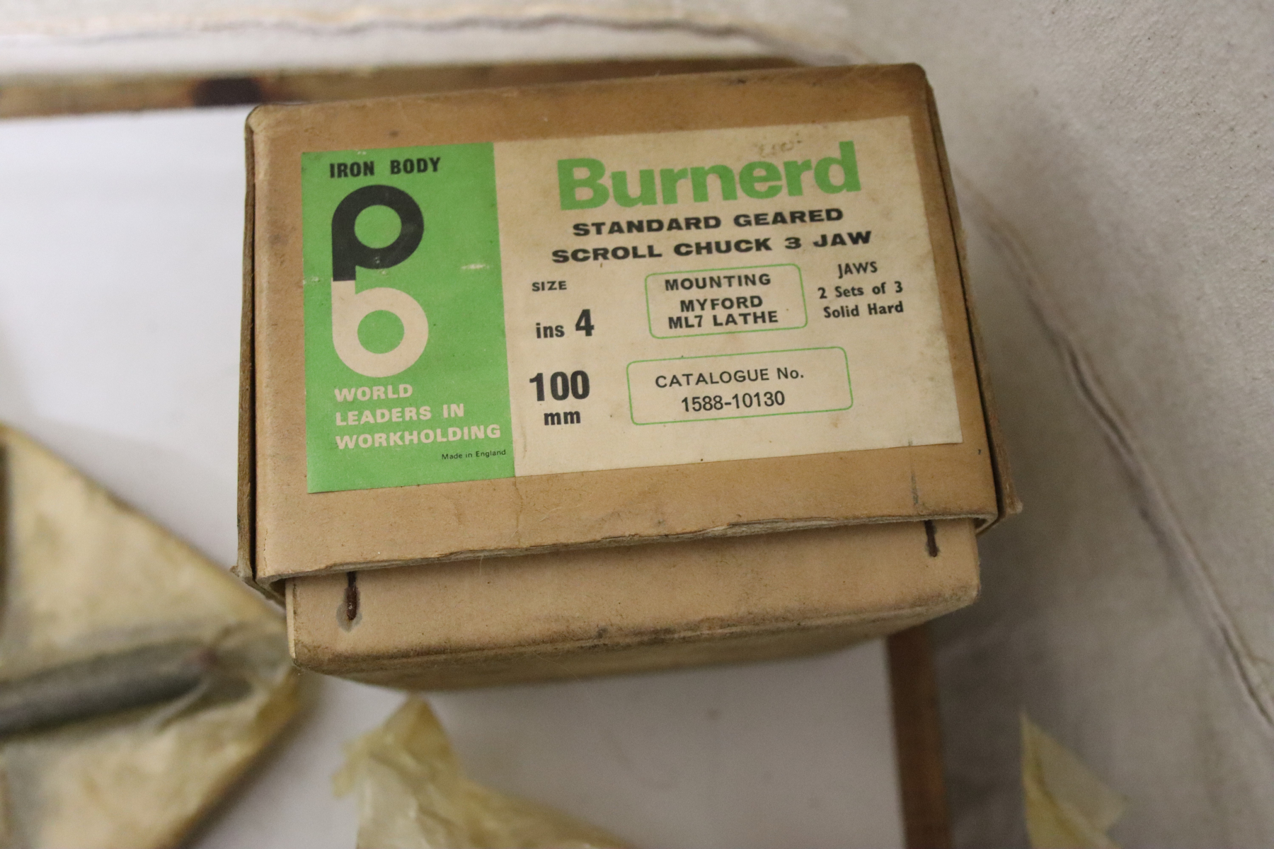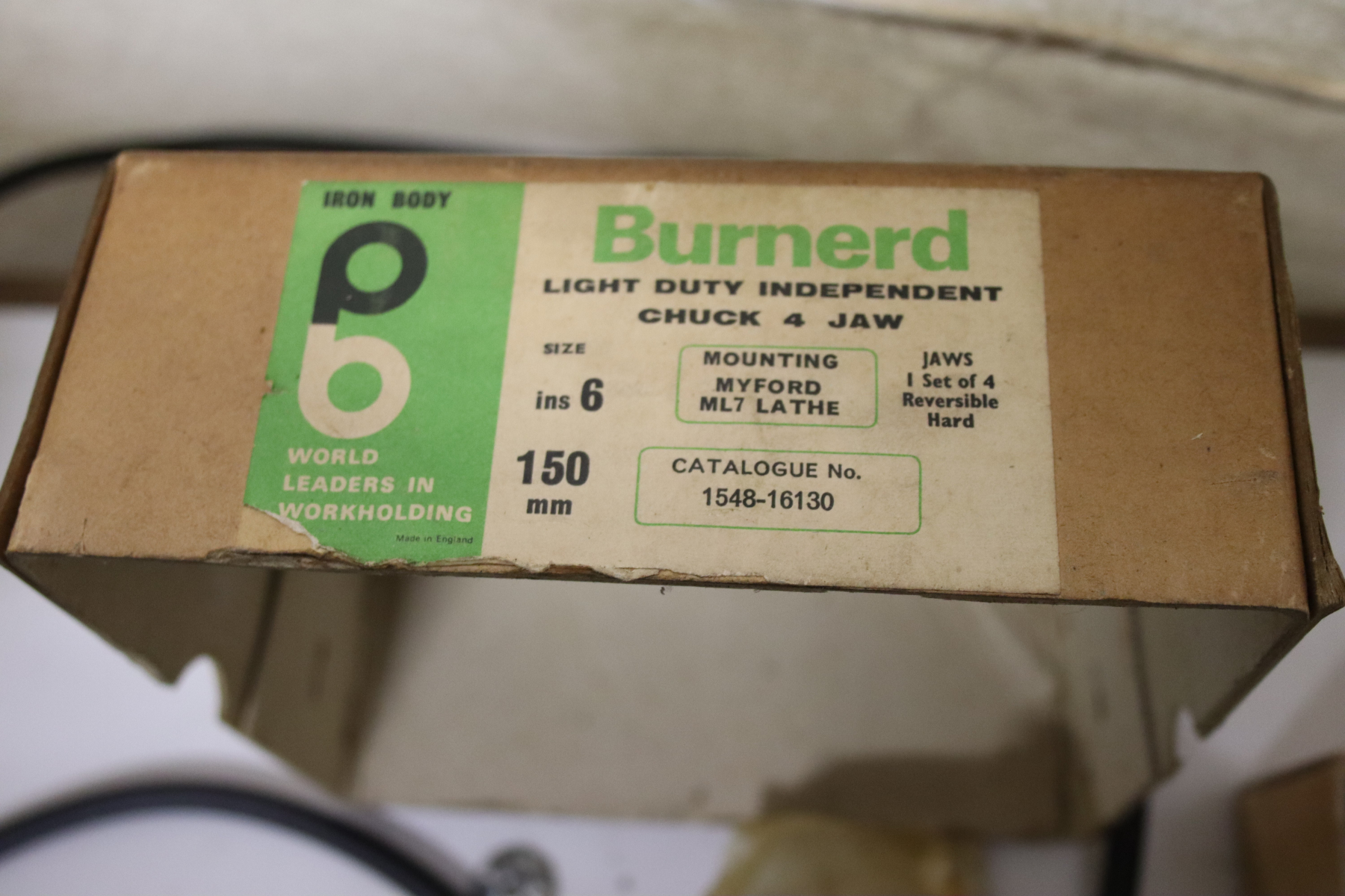 - Unused Burnerd independent 4 jaw chuck, catalogue item 1548-16130, with integral Myford lathe mounting plus 1 set of jaws + chuck key. This item is still in the original packaging, with protective oil coating