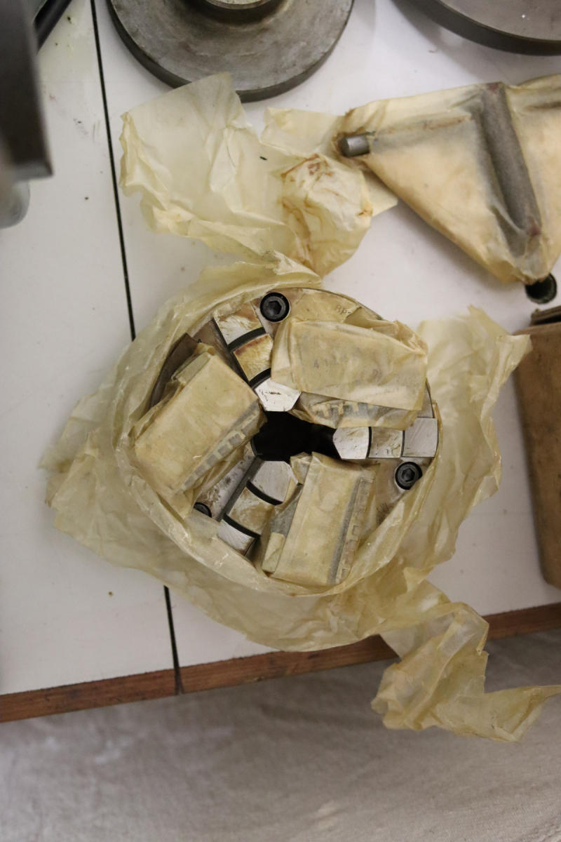 - Unused Burnerd 4″ 3 jaw scroll chuck, catalogue item 1588-10130, with integral Myford lathe mounting plus 2 sets of jaws + chuck key. This item is still in the original packaging, with protective oil coating