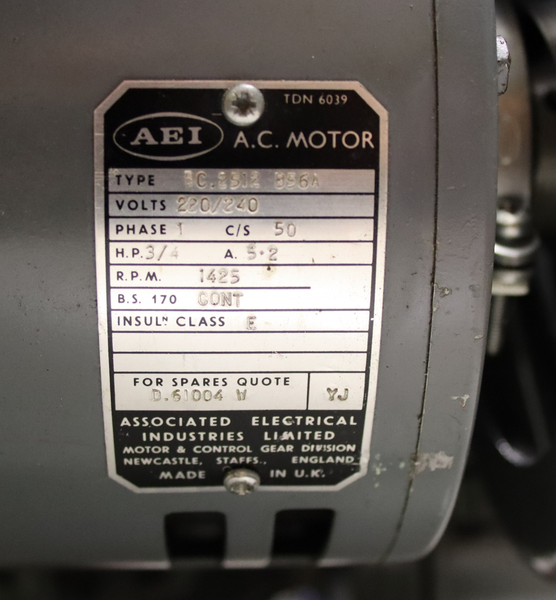 The lathe is powered by a single phase AEI 3/4HP 220/240V motor. The motor is wired for forward operation. If required, forward & reverse operation can be achieved using with the Dewhurst switch on the stand, with suitable 5 core cable being used from the switch to the motor and reconfiguration of the motor wiring connections.