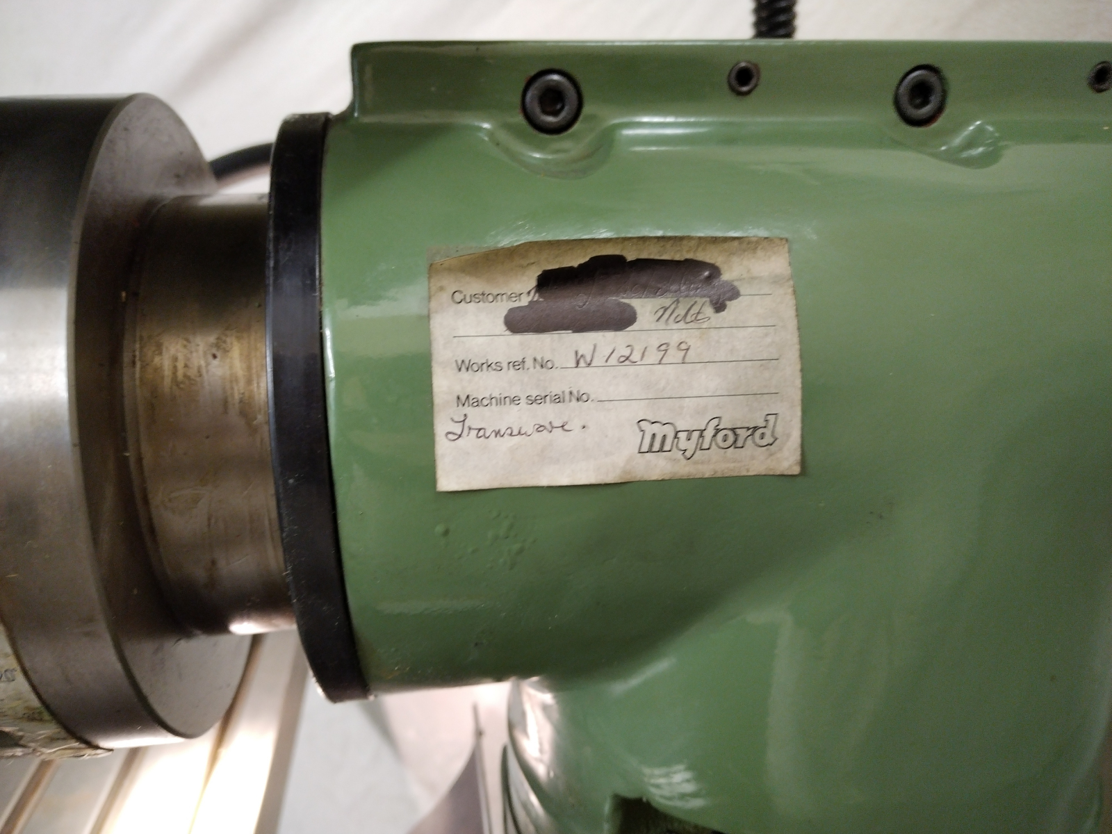 This is a Myford VMF turret milling machine, serial number 3307 manufactured in 1999. Further information about this model of mill can be found on the excellent lathes.co.uk website here.