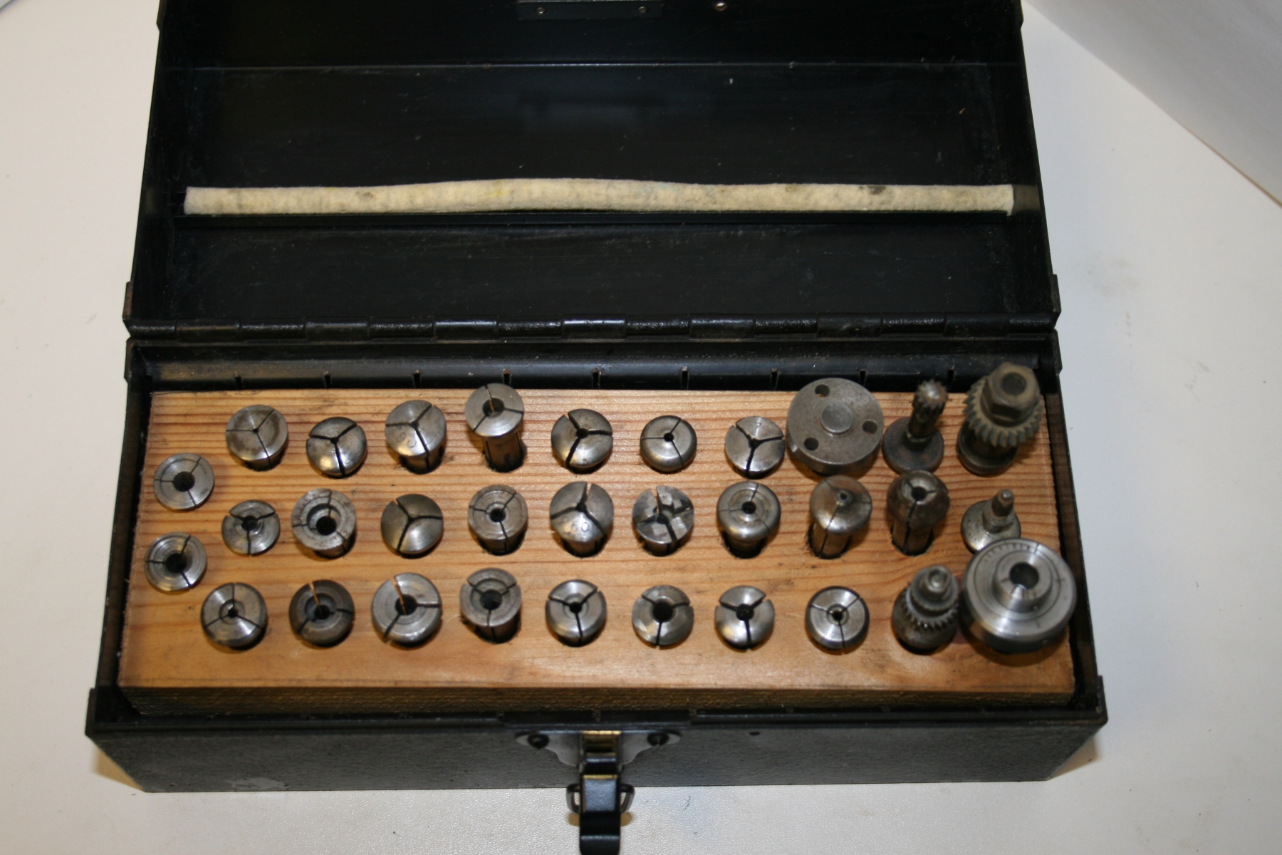 Selection of collets have a 30TPI thread to them – possibly 9/32″ x 30TPI. As well as the collets to grip a round bar, there is a small face plate, a boring tool holder and a couple of milling type cutters.