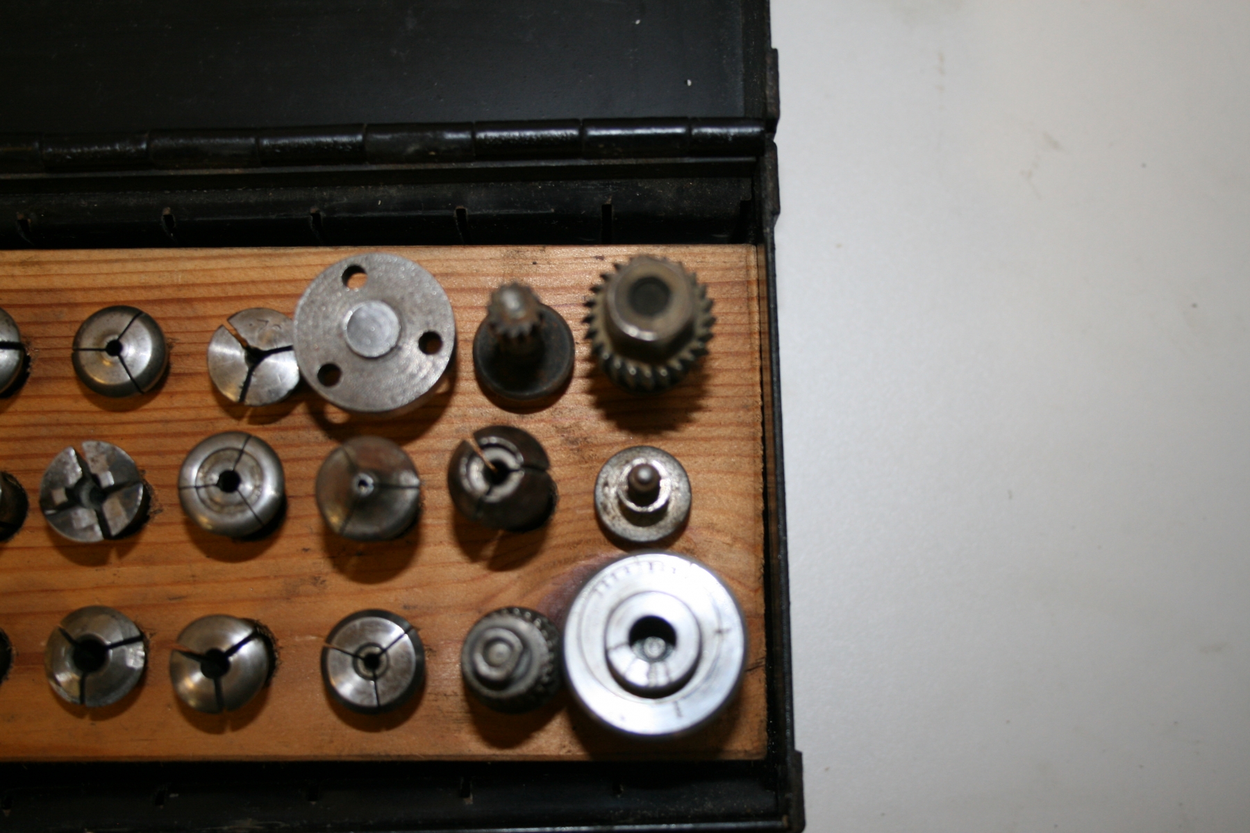 Selection of collets have a 30TPI thread to them – possibly 9/32″ x 30TPI. As well as the collets to grip a round bar, there is a small face plate, a boring tool holder and a couple of milling type cutters.